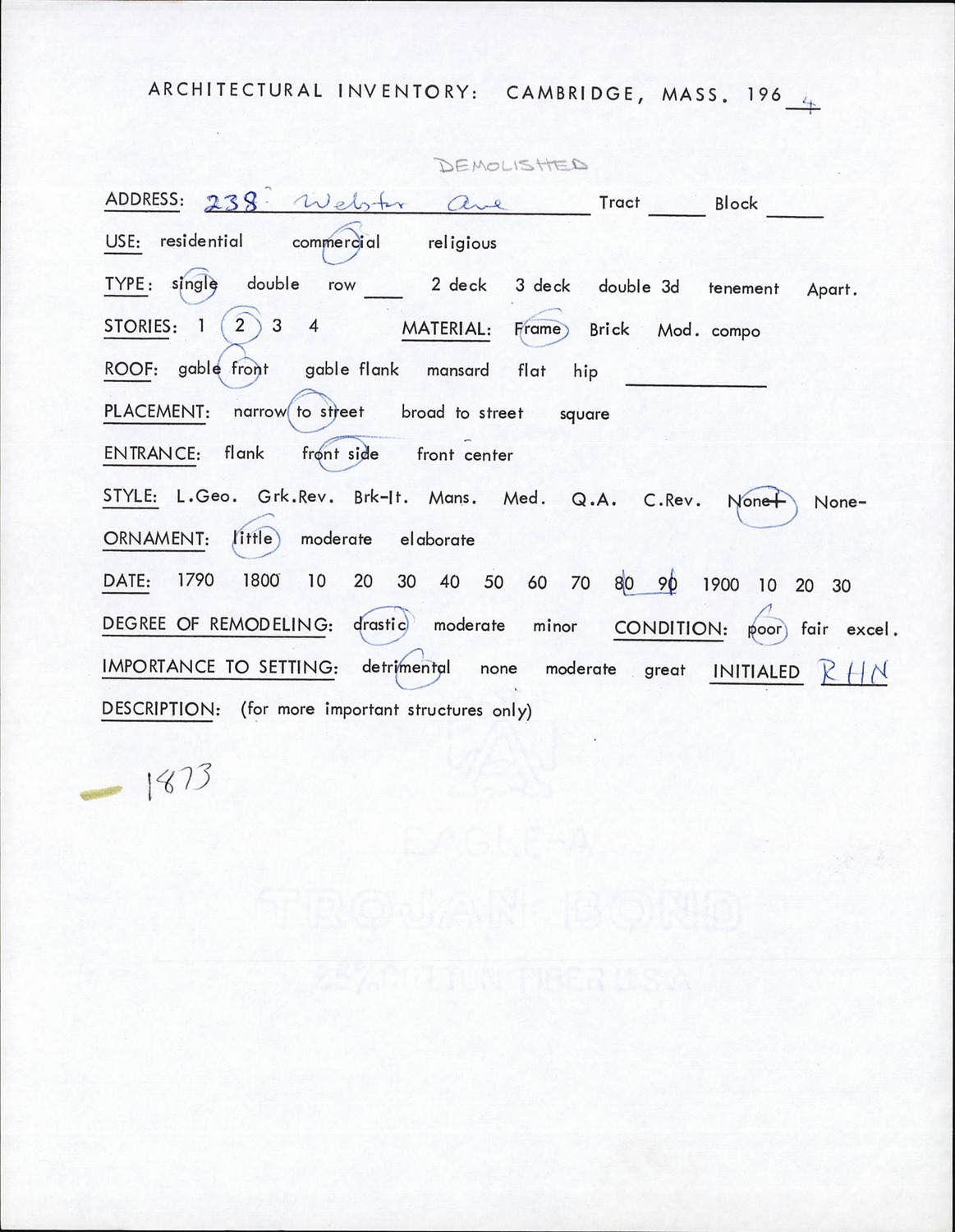 238 Webster Ave - Architectural Inventory Form