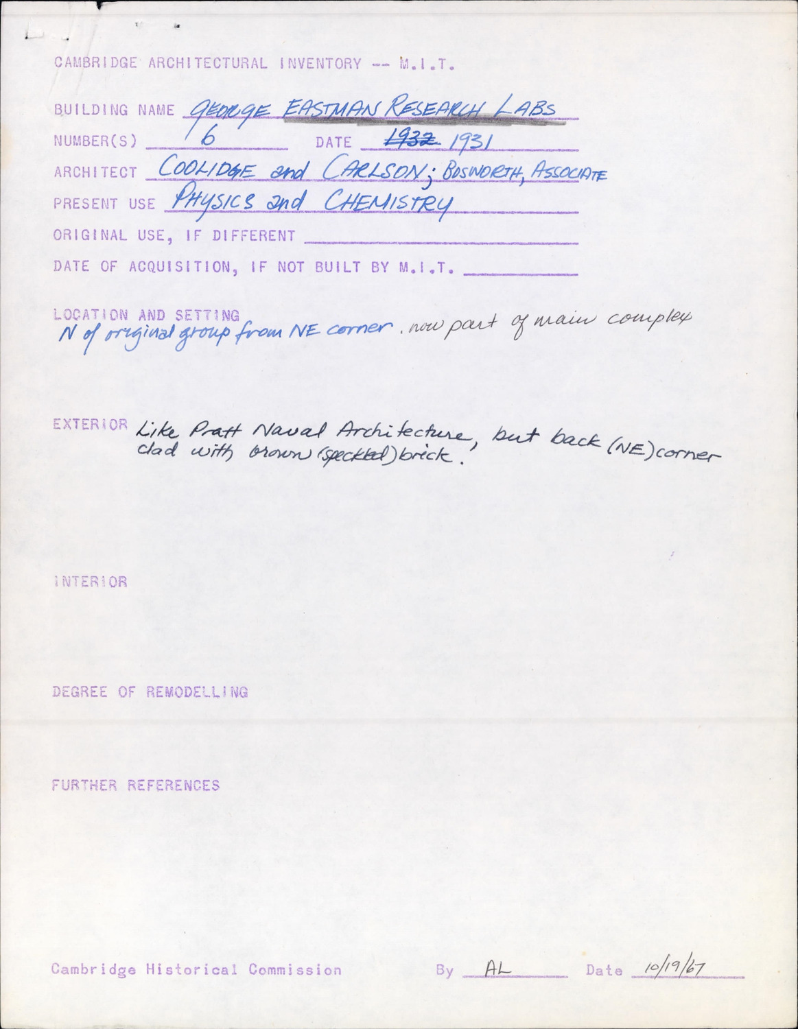 182R Memorial Dr - MIT Bldg 6 - Eastman Laboratories - Architectural Inventory Form