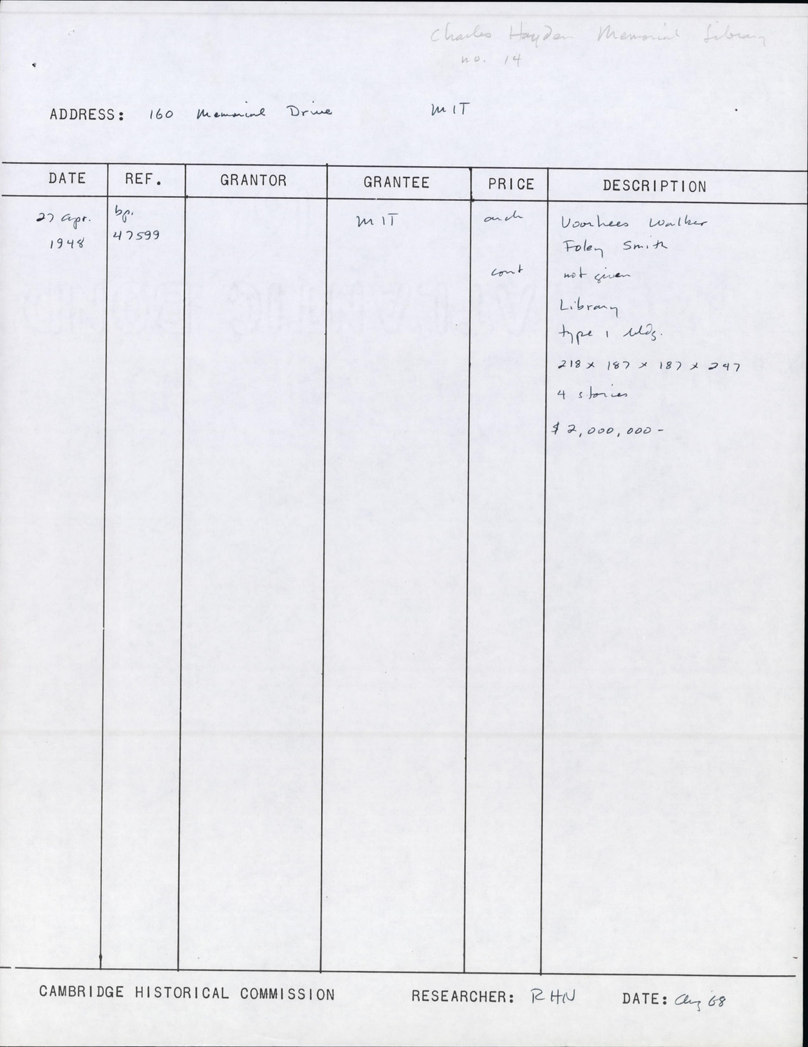 170 Memorial Dr - MIT Bldg 14 - Hayden Library - Research Form