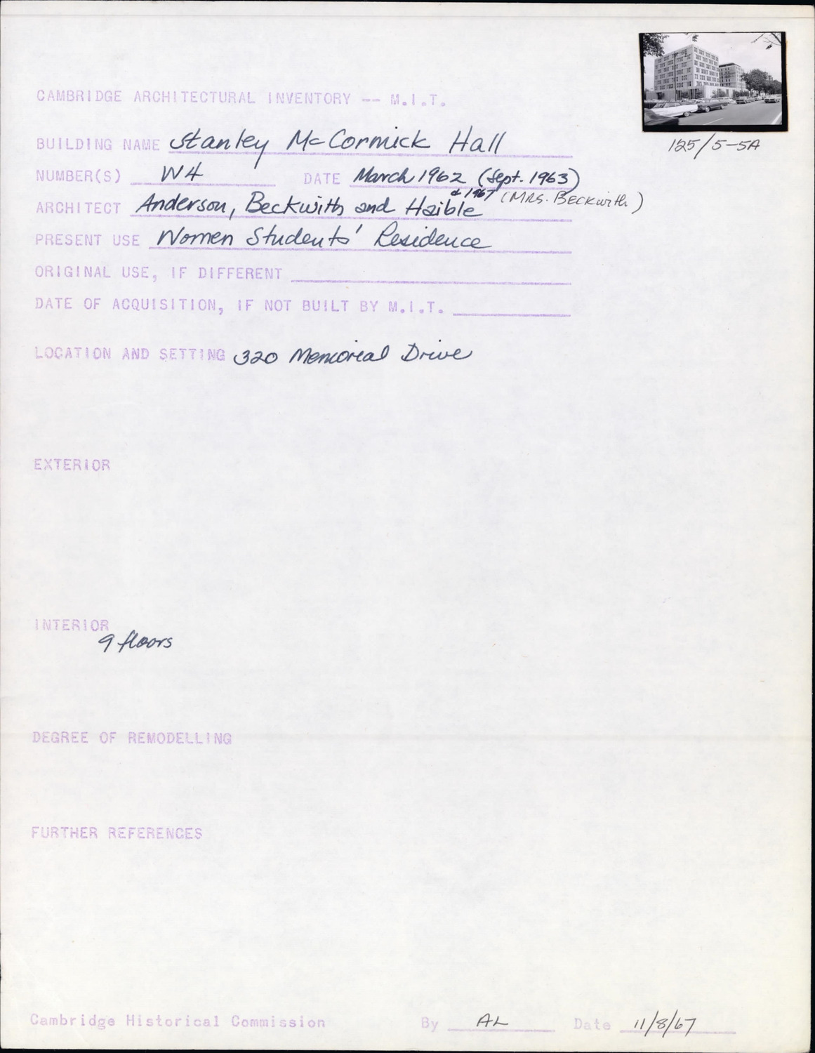 320 Memorial Dr - MIT McCormick Hall - Architectural Inventory Form