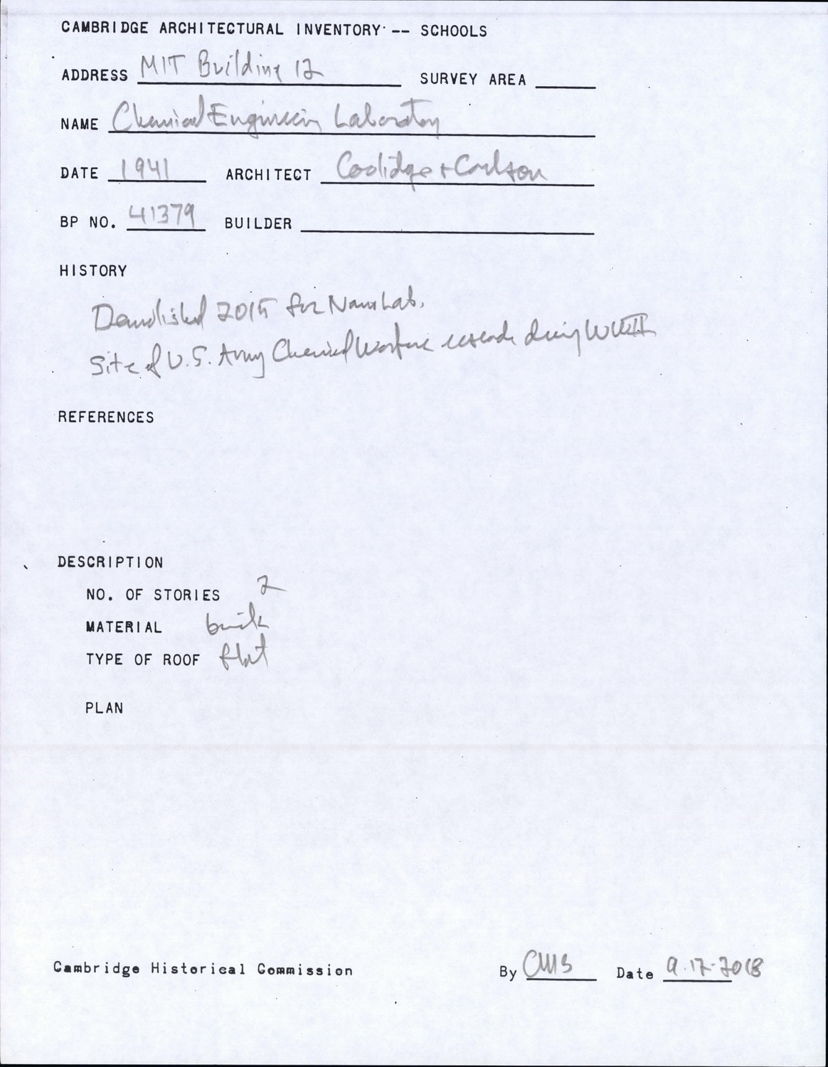 60R Vassar St - MIT Bldg 12 - Chemical Warfare Lab - Architectural Inventory Form