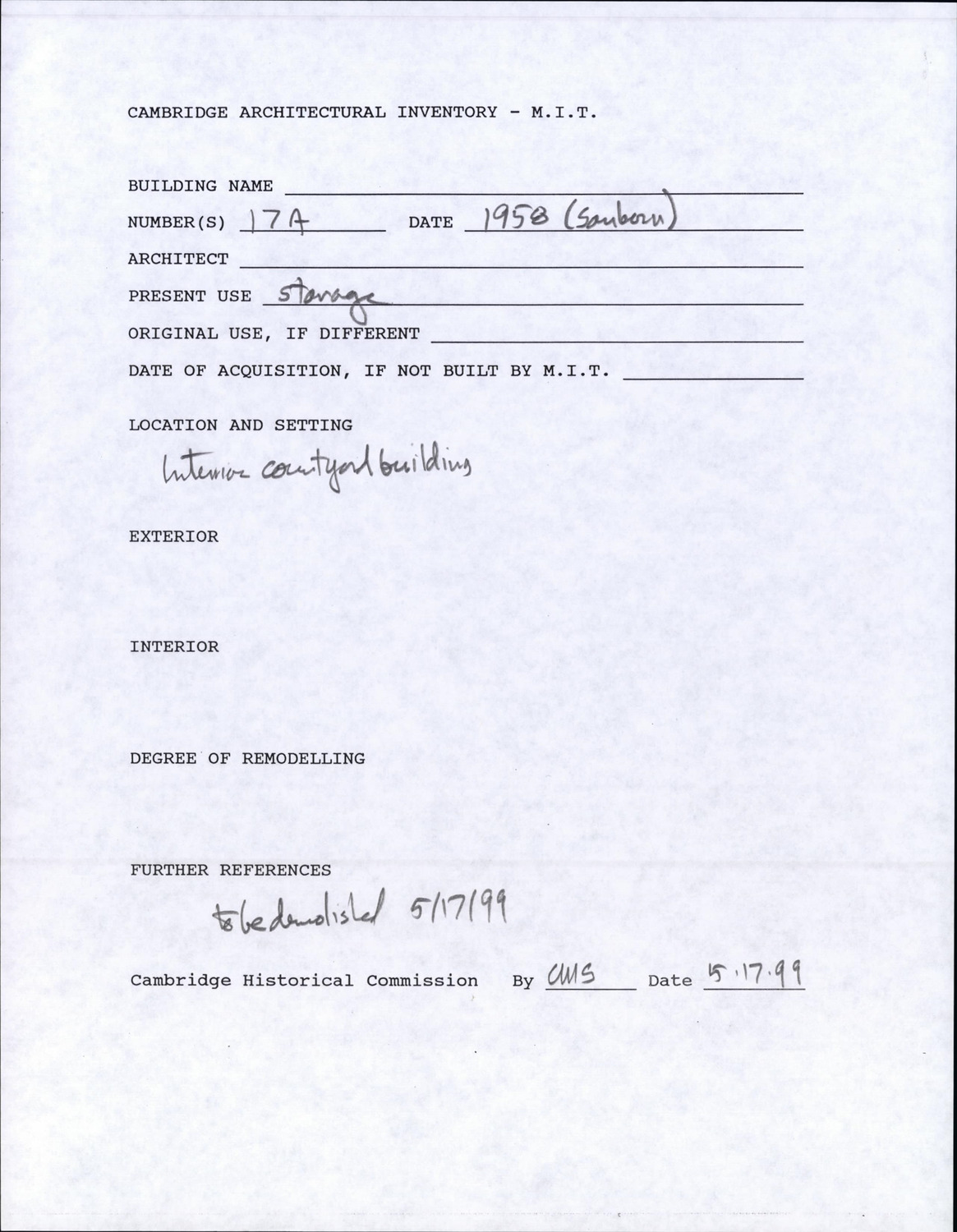 76R Vassar St - MIT Bldg 17A - Architectural Inventory Form