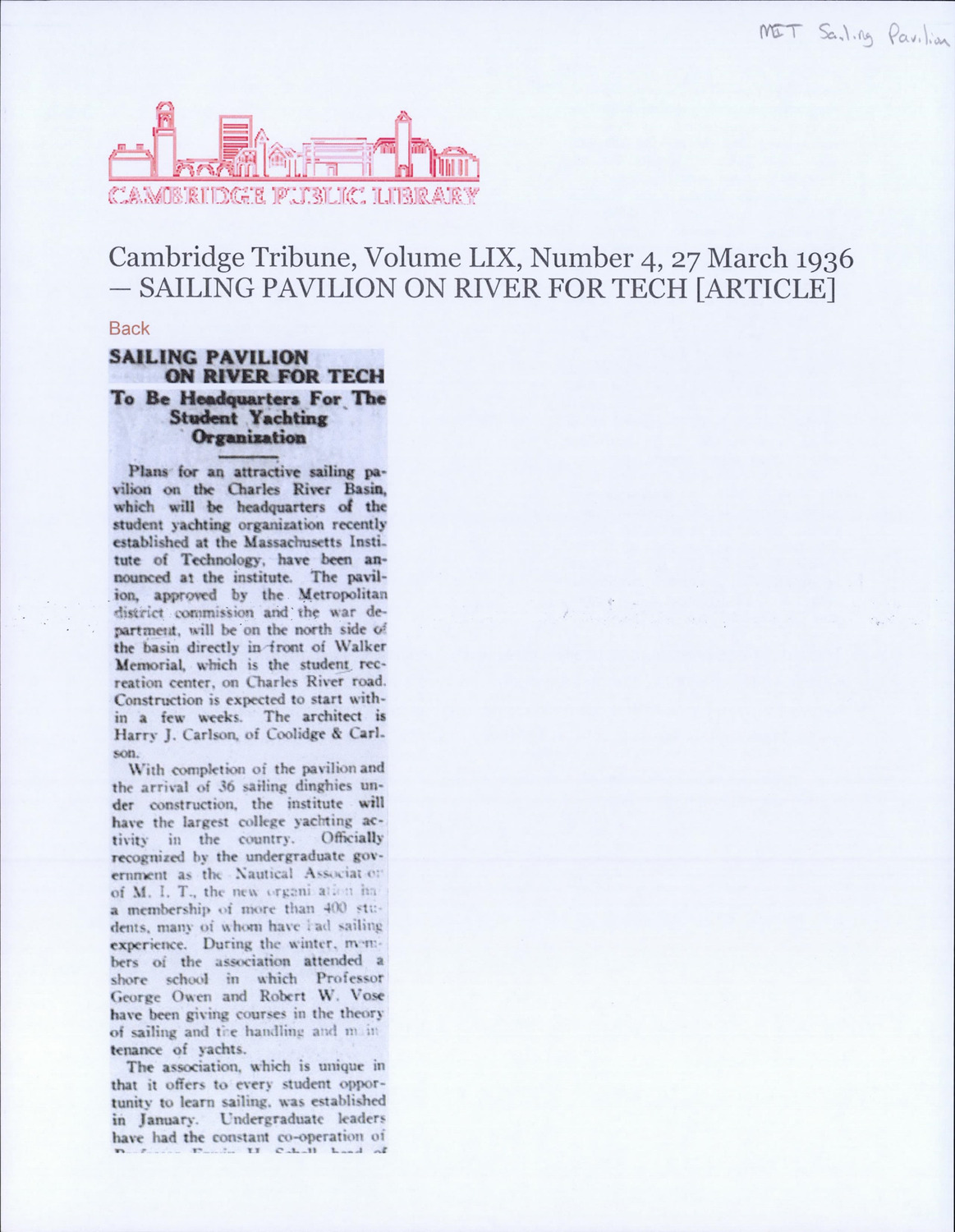 134 Memorial Dr - MIT Bldg 51 - Sailing Pavilion - Published Material