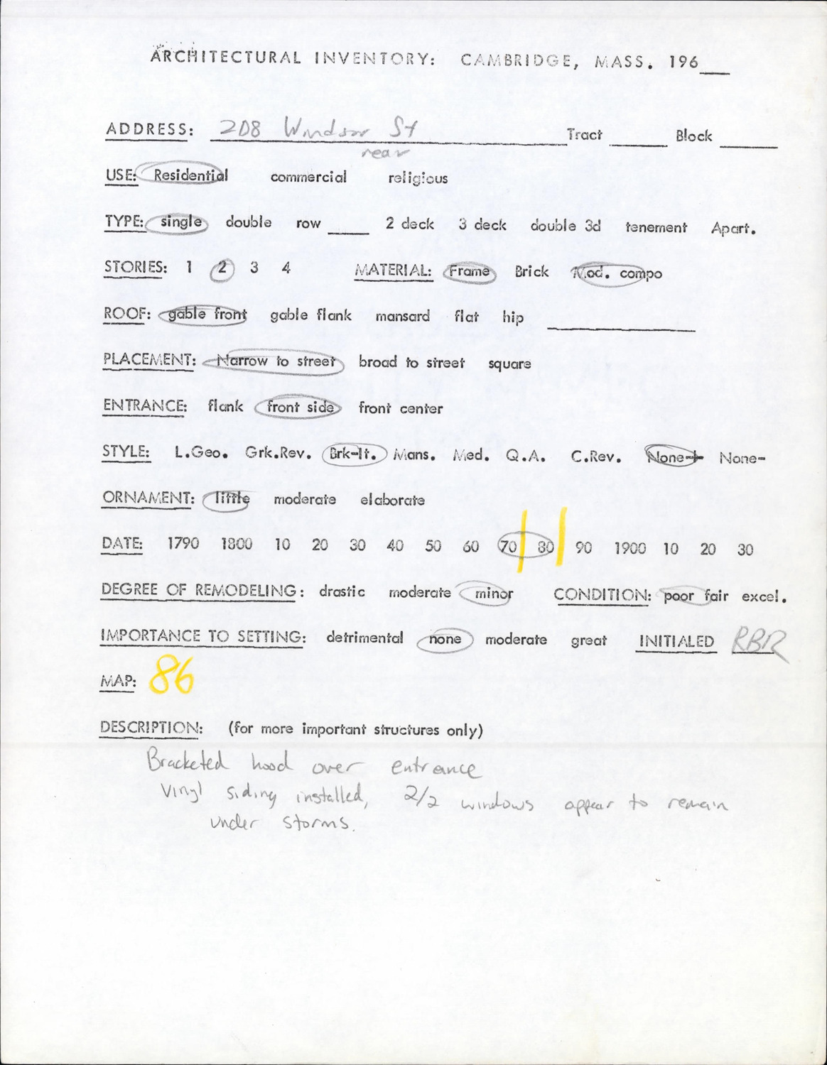 208 Windsor St rear - Architectural Inventory Form