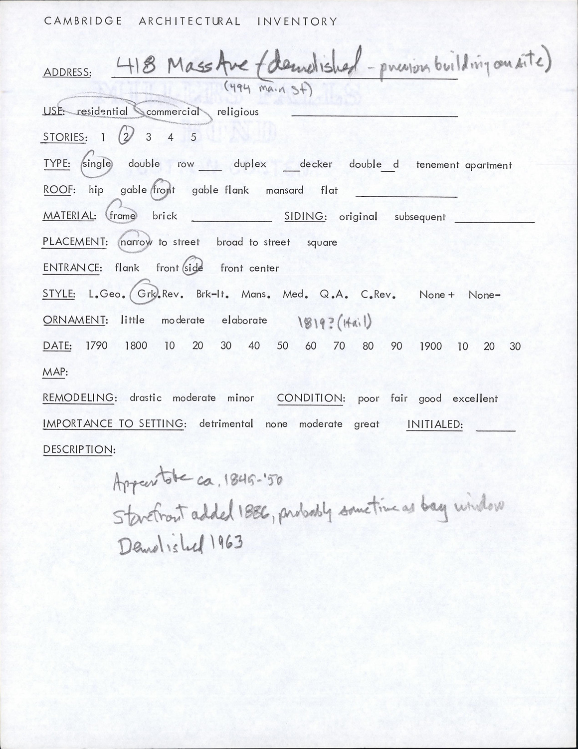 418 Massachusetts Ave - Architectural Inventory Form