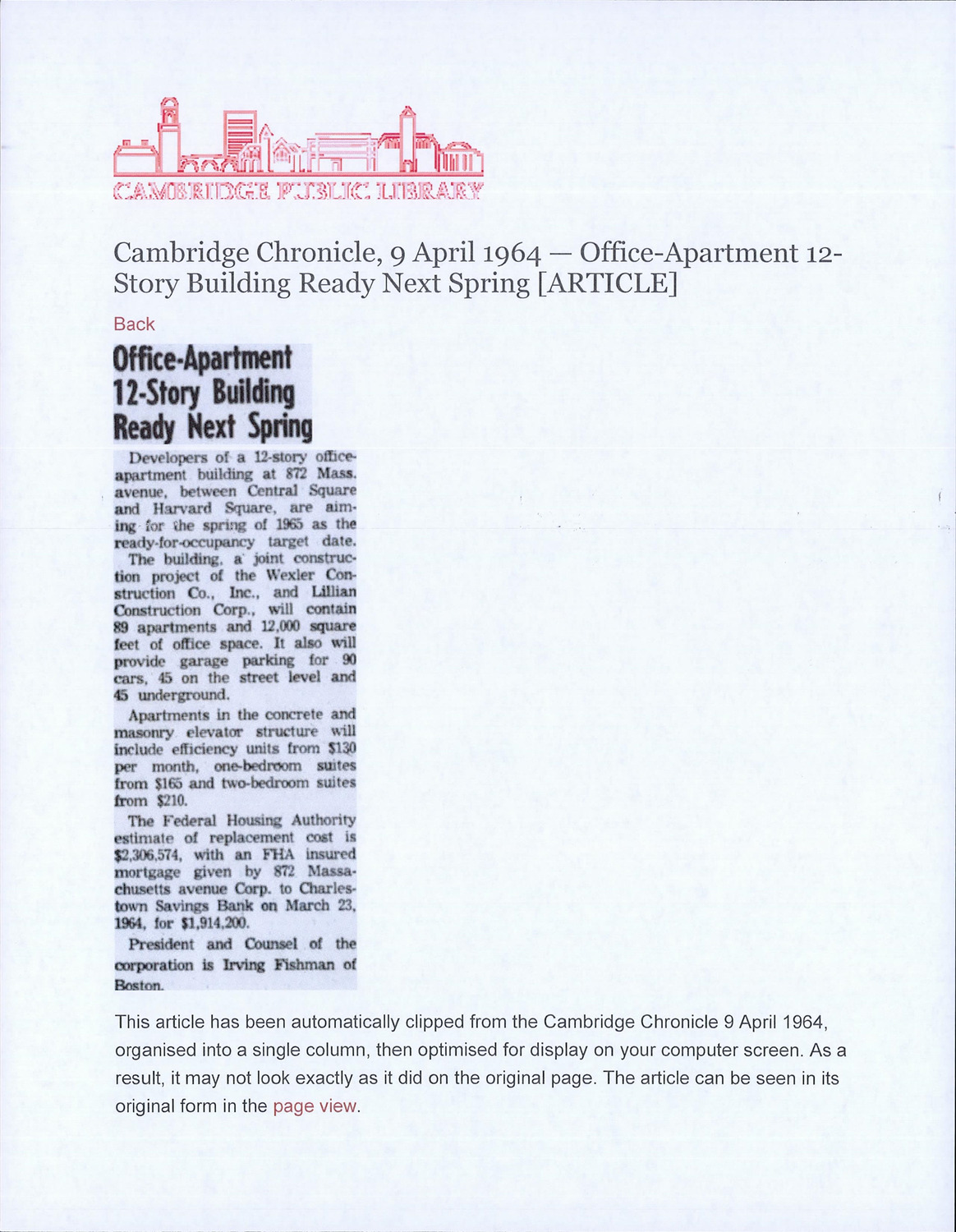 - Cambridge Historical Commission, Digital Architectural Survey and History.