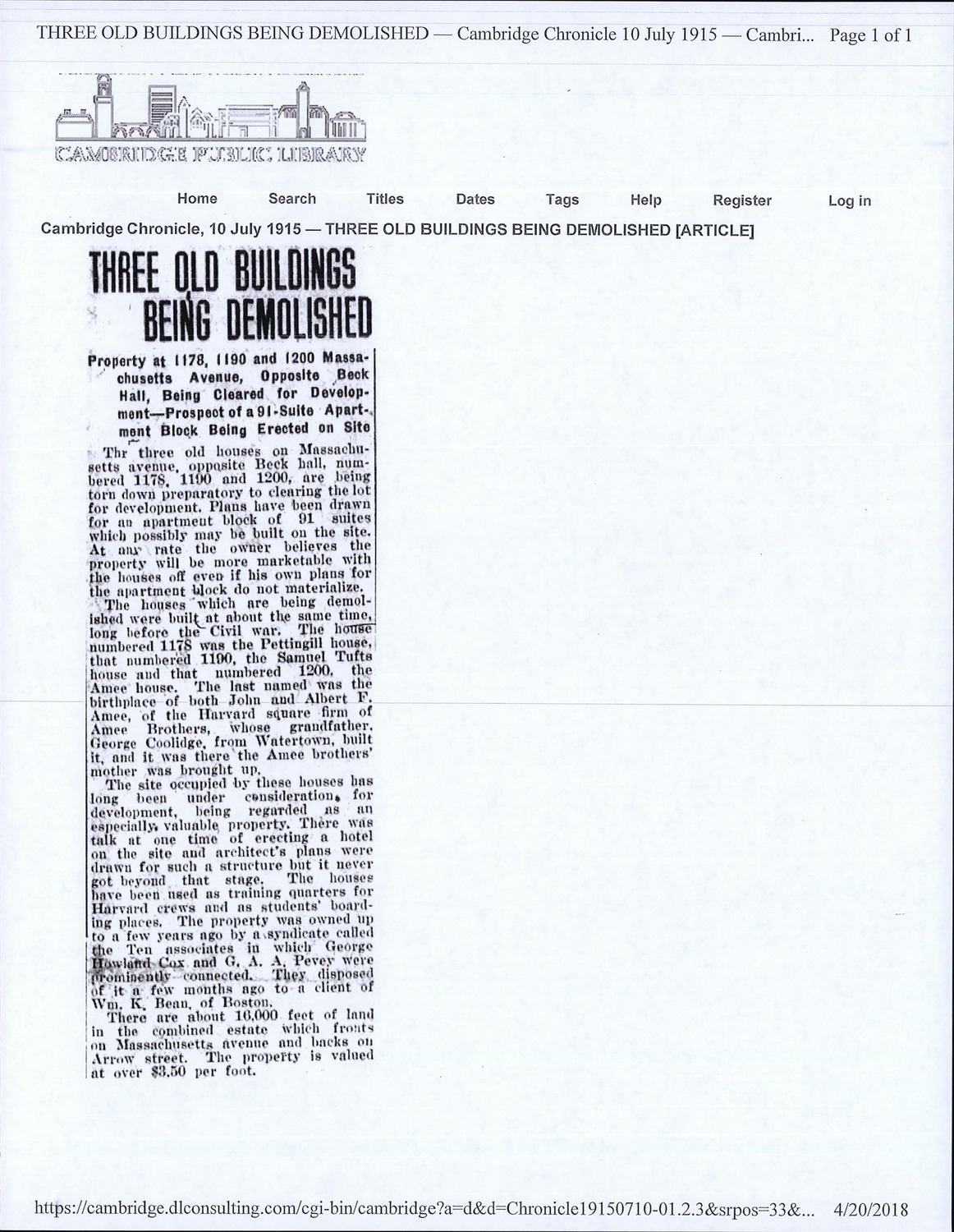 - Cambridge Historical Commission, Digital Architectural Survey and History.