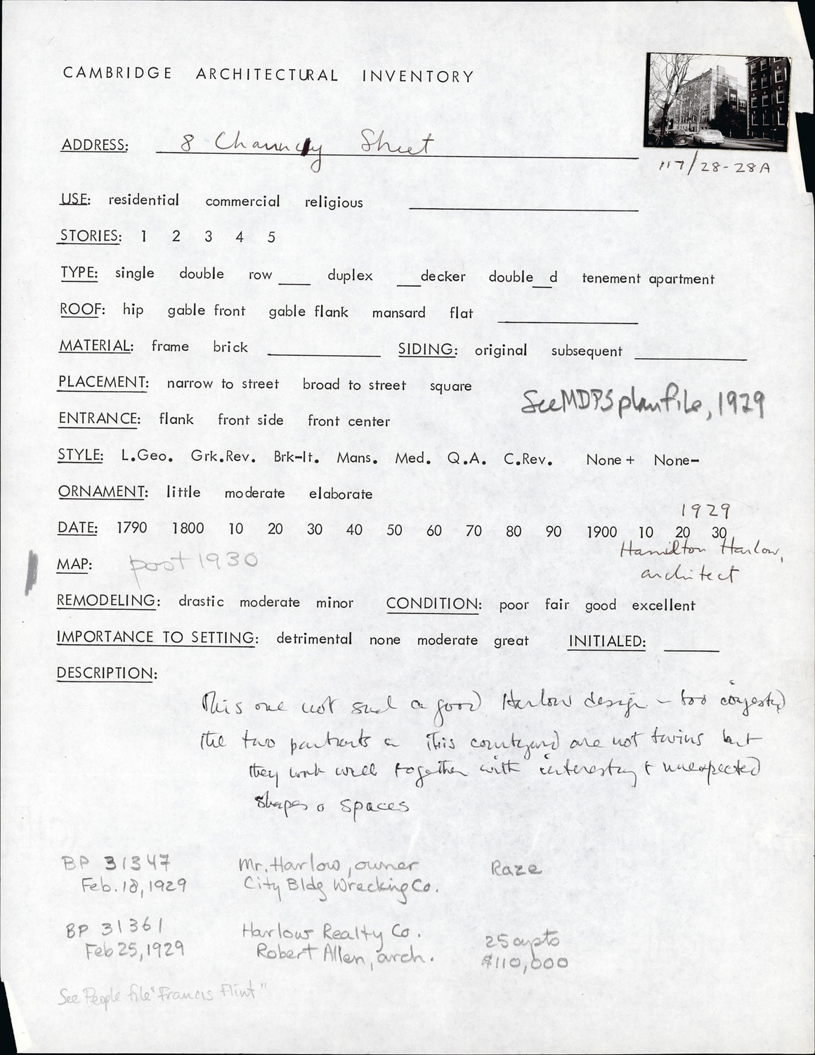 - Cambridge Historical Commission, Digital Architectural Survey and History.