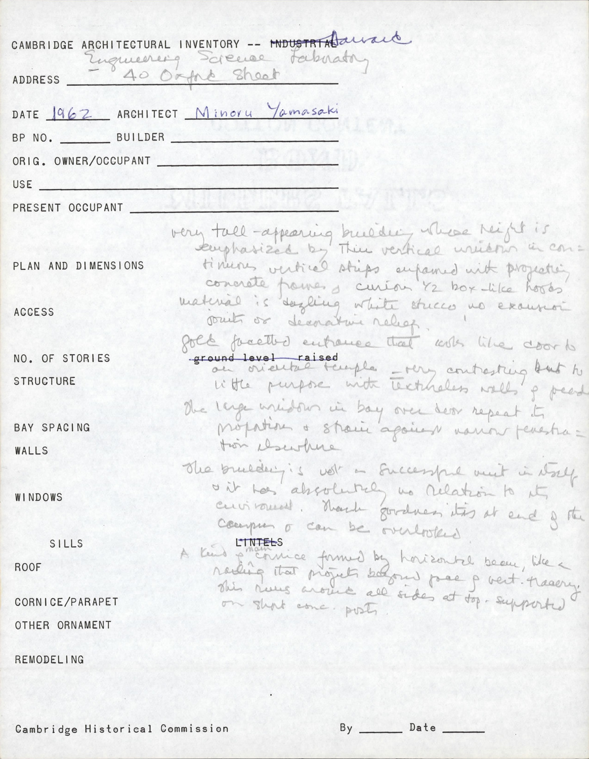 40 Oxford St - Engineering Science Laboratory - Architectural Inventory Form