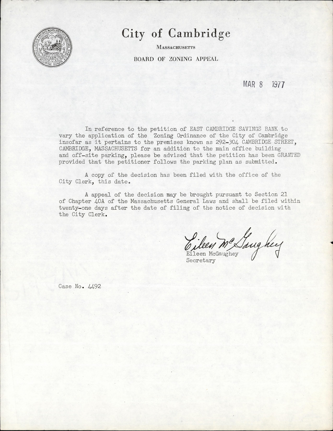 292 Cambridge St - East Cambridge Savings Bank - Correspondence