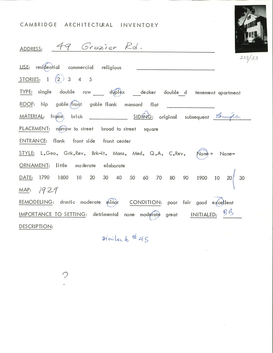 49 Grozier Rd - Architectural Inventory Form
