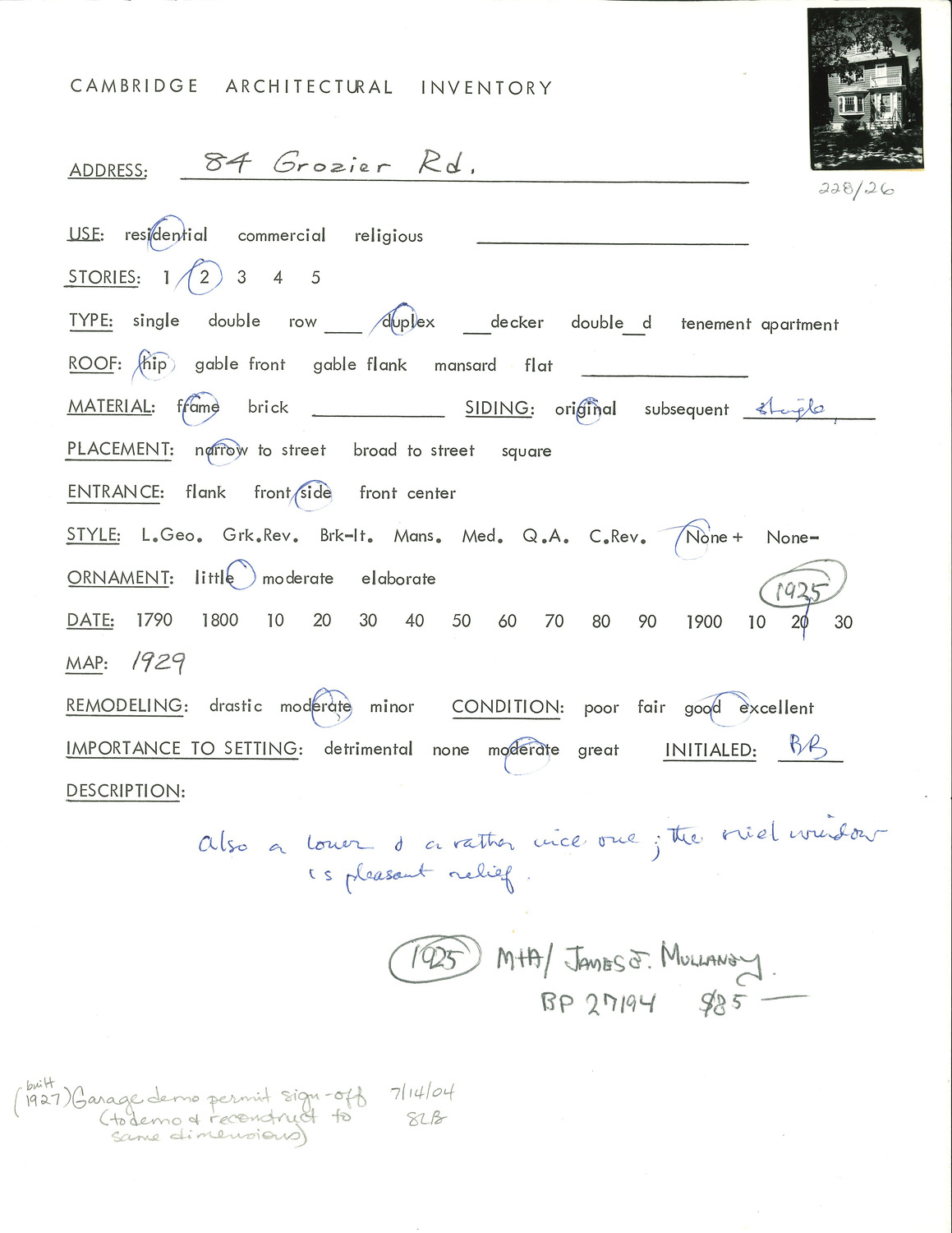 84 Grozier Rd - Architectural Inventory Form