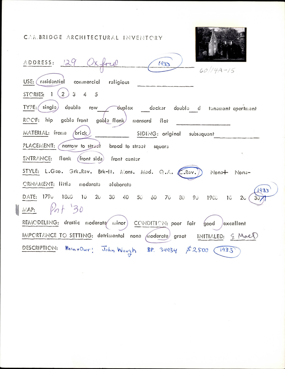129 Oxford St - Architectural Inventory Form