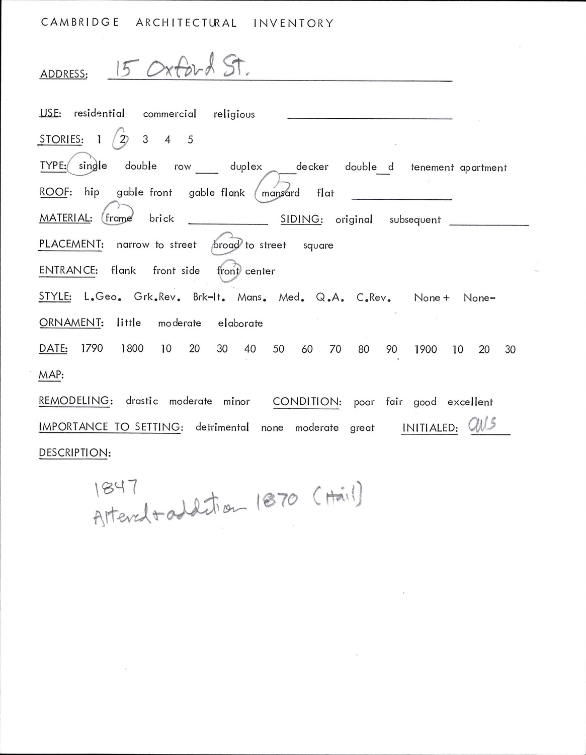 15 Oxford St - Architectural Inventory Form