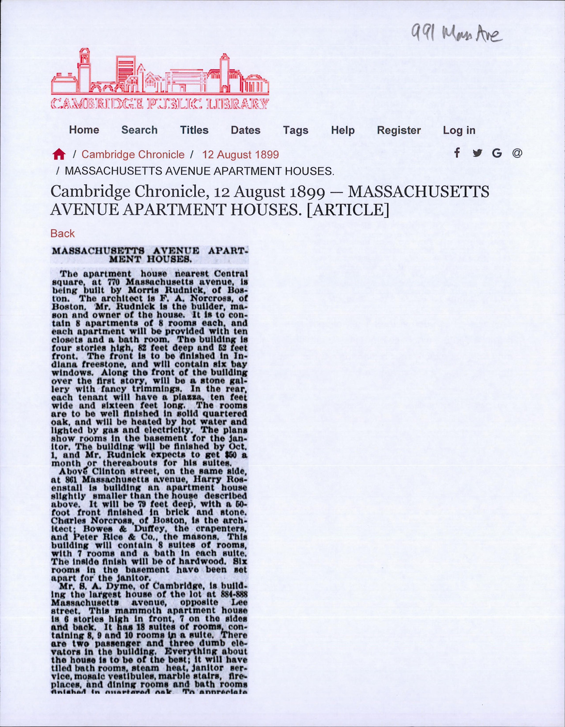 - Cambridge Historical Commission, Digital Architectural Survey and History.