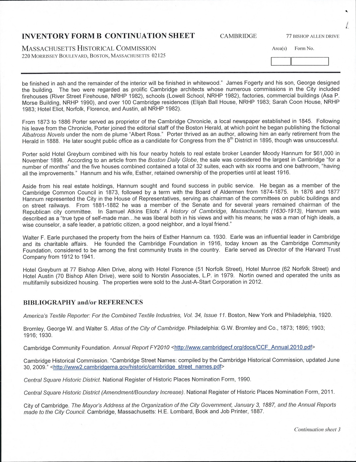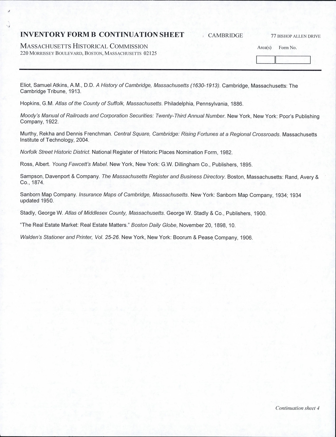 - Cambridge Historical Commission, Digital Architectural Survey and History.