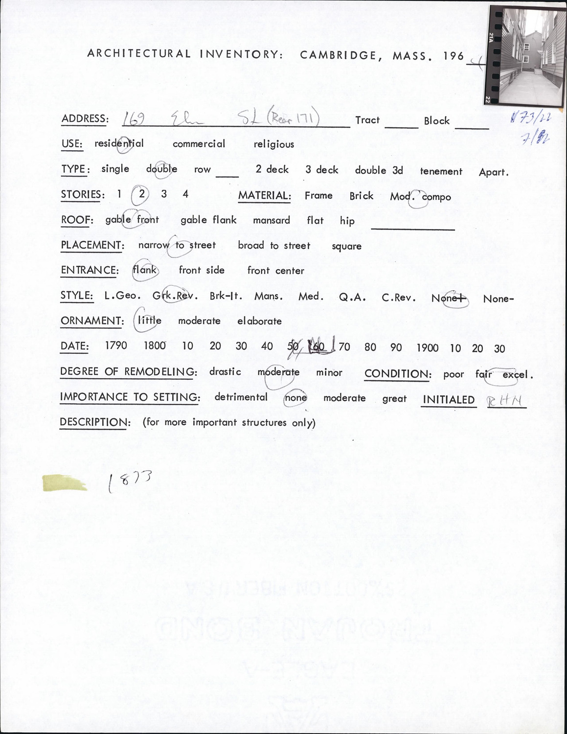 169 Elm St - Architectural Inventory Form