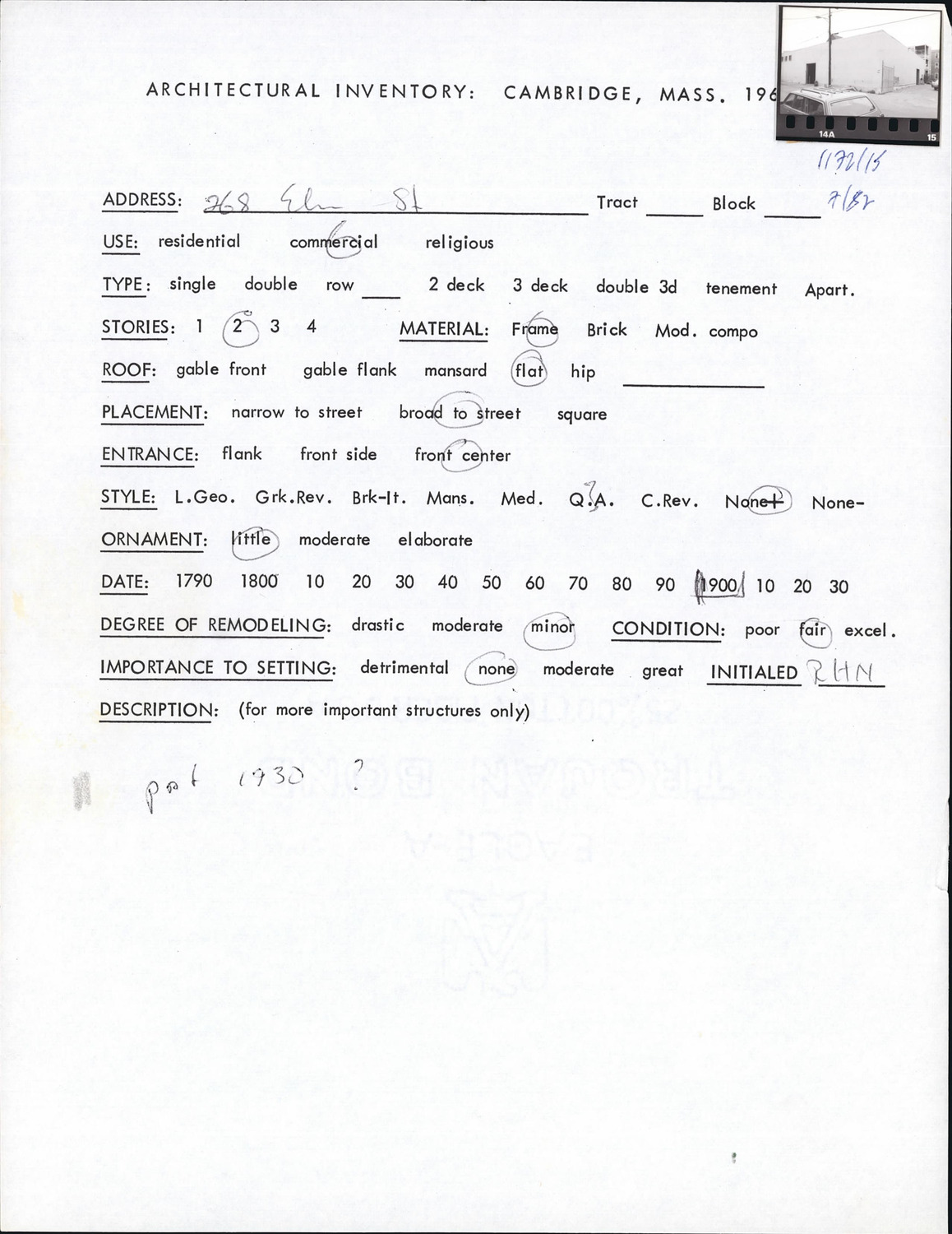 268 Elm St - Architectural Inventory Form